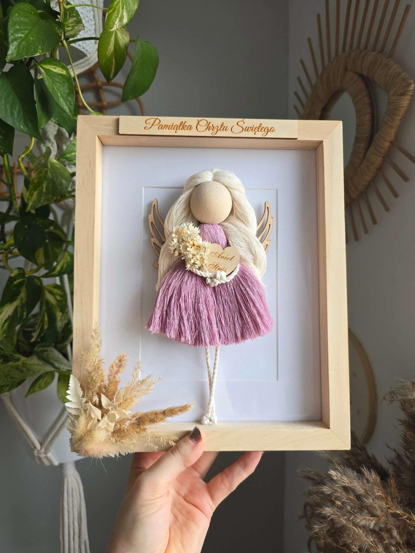 Makramowy aniołek w pięknej drewnianej ramce to nie tylko wyjątkowy prezent na ważne uroczystości jak np. I Komunia Święta, Chrzest czy roczek dziewczynki/chłopca i wiele innych.
