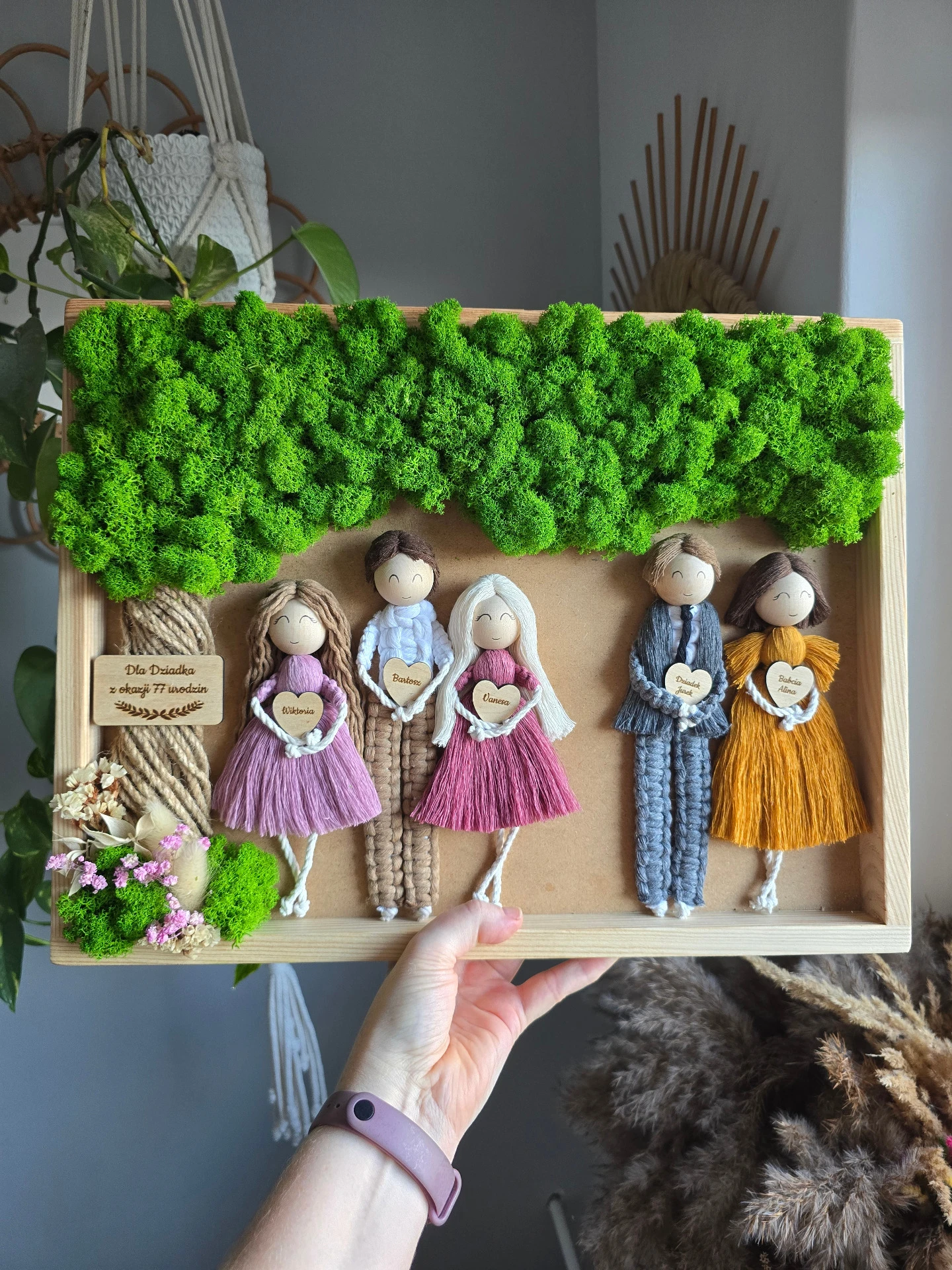 Makramowe laleczki w pięknej drewnianej ramce to wyjątkowa i niepowtarzalna pamiątka. Ręcznie stworzony portret rodzinny stanie się nie tylko ozdobą Twojego wnętrza, ale również unikalnym prezentem dla bliskich na każdą okazję. Idealnie sprawdzi się jako upominek na urodziny, rocznicę, parapetówkę czy ślub.