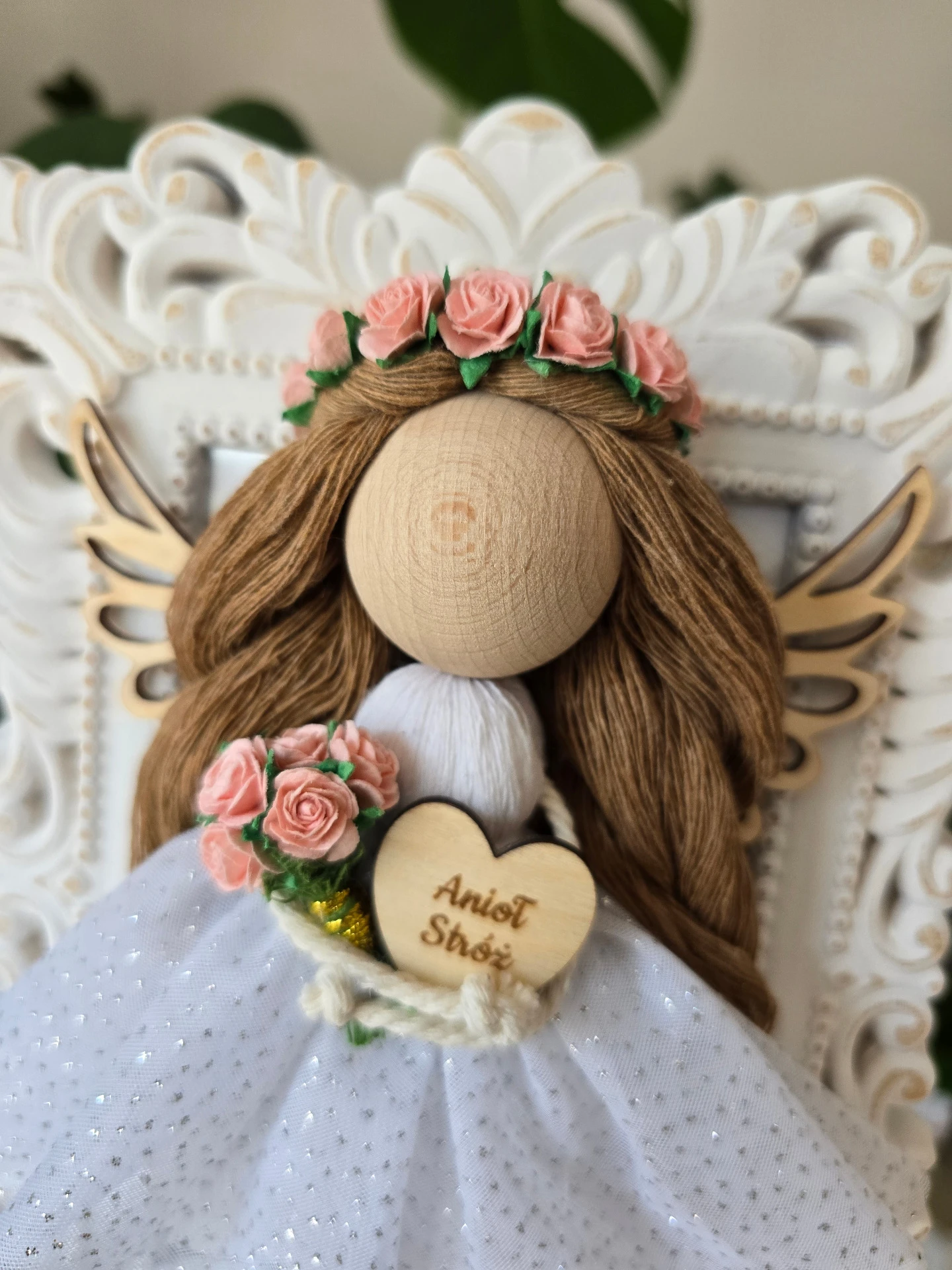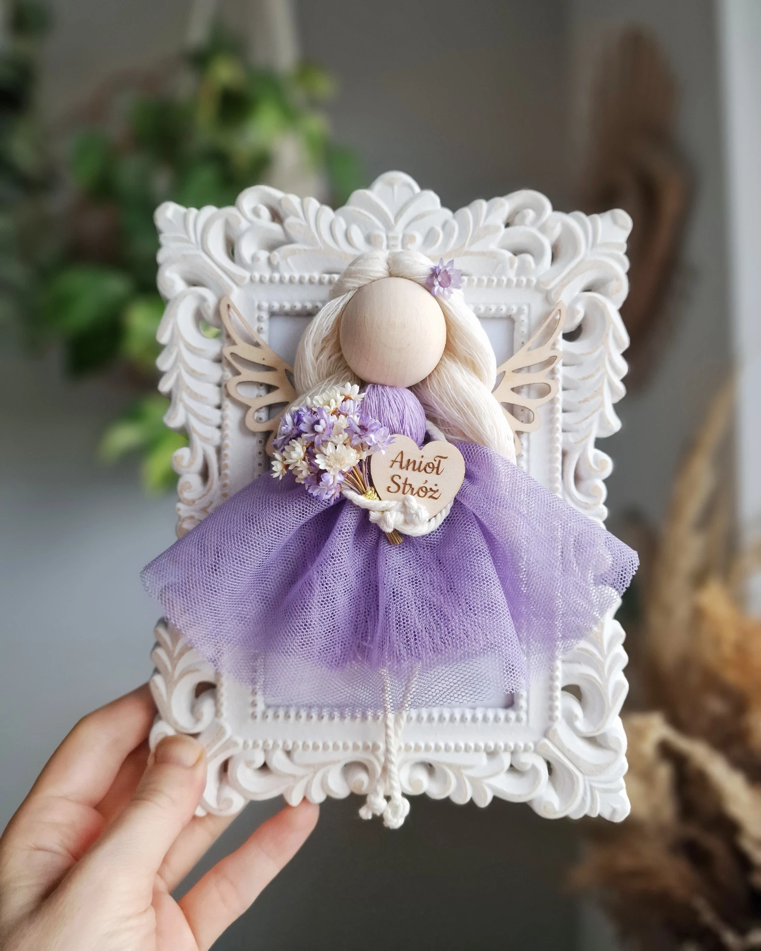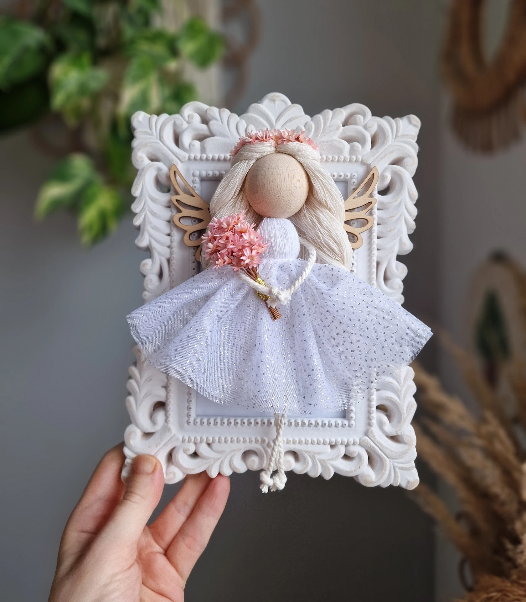 Makramowy aniołek to nie tylko wyjątkowy prezent na ważne uroczystości jak Komunia Święta, Chrzest czy roczek dziewczynki.