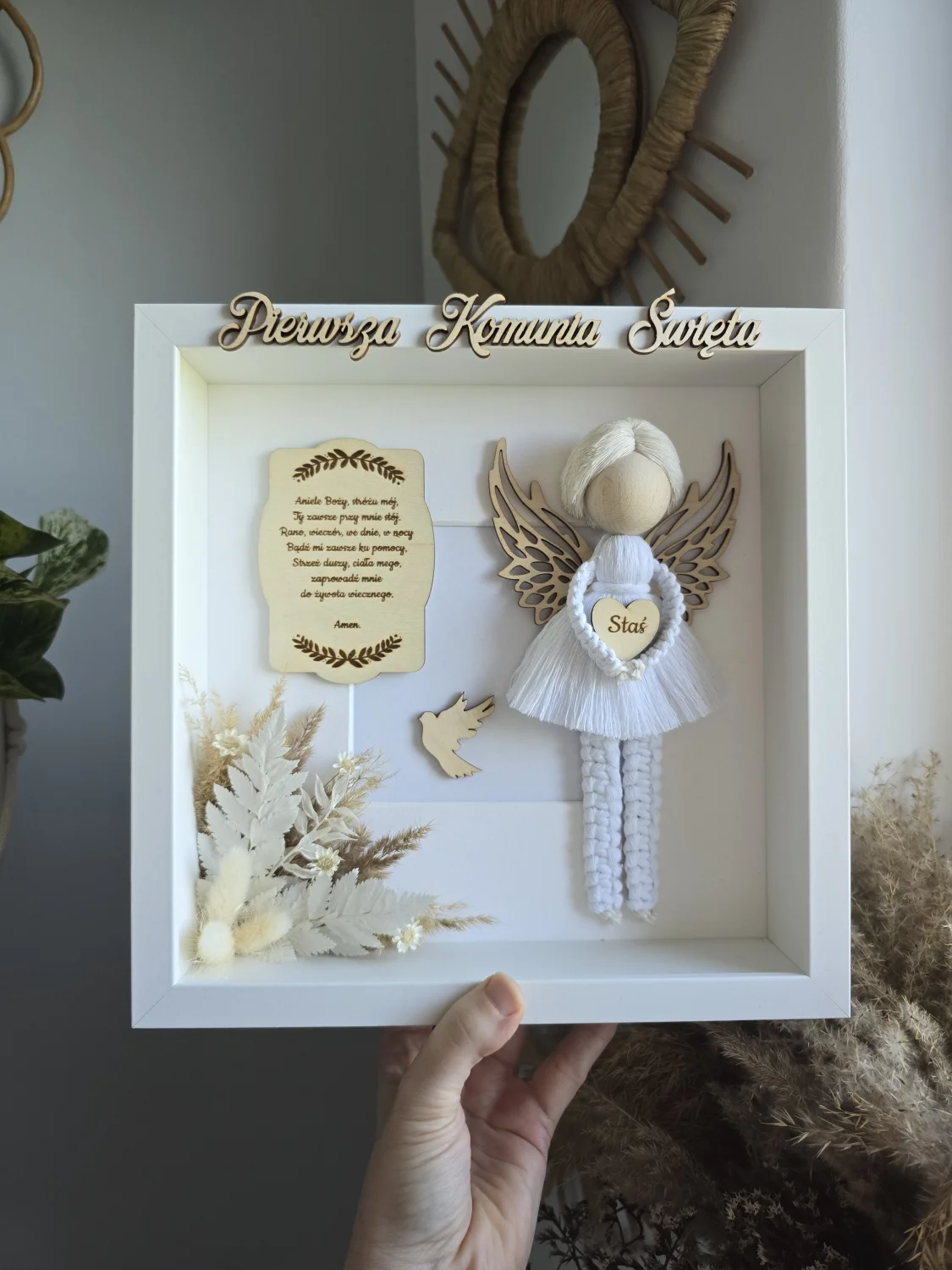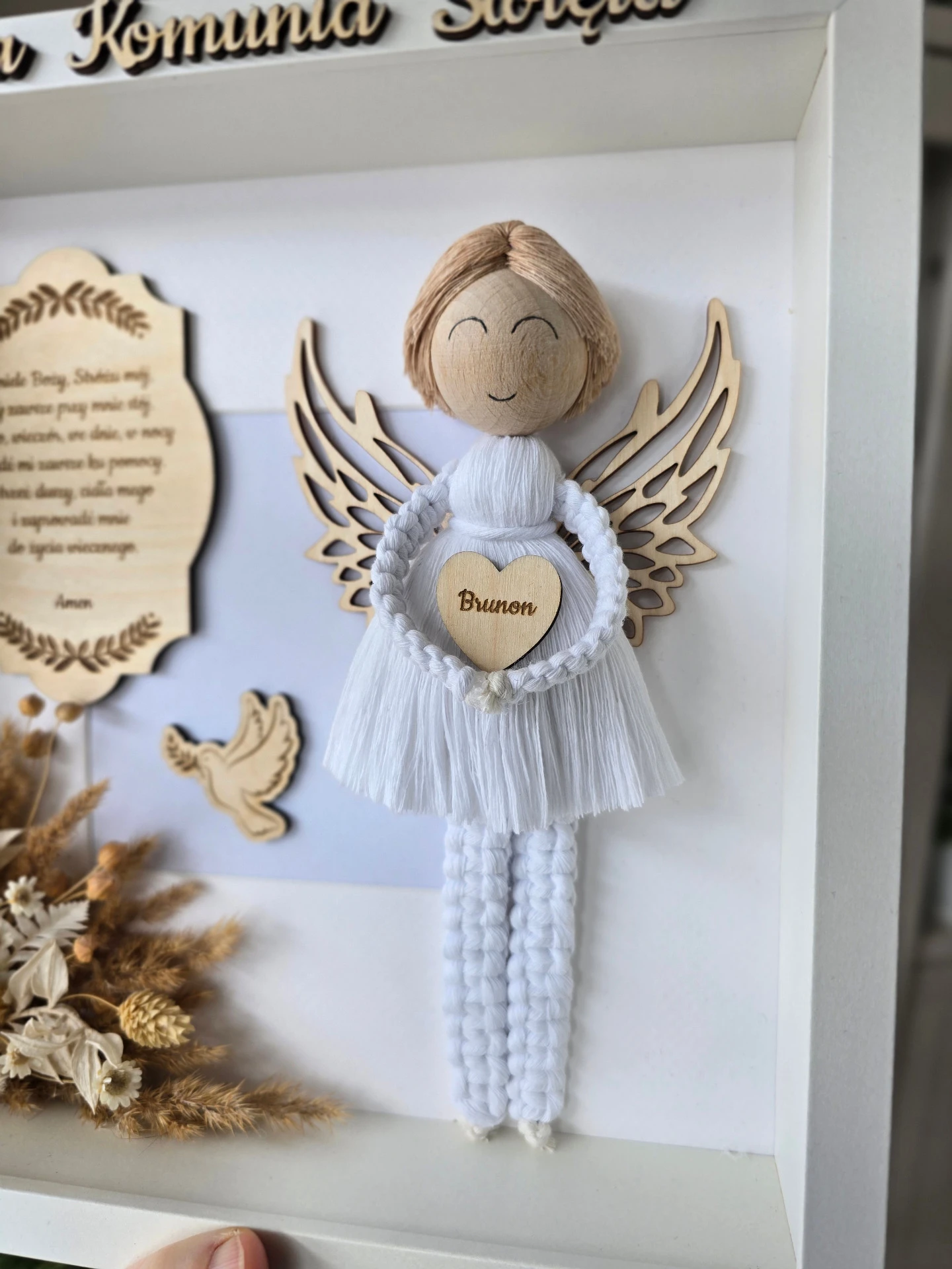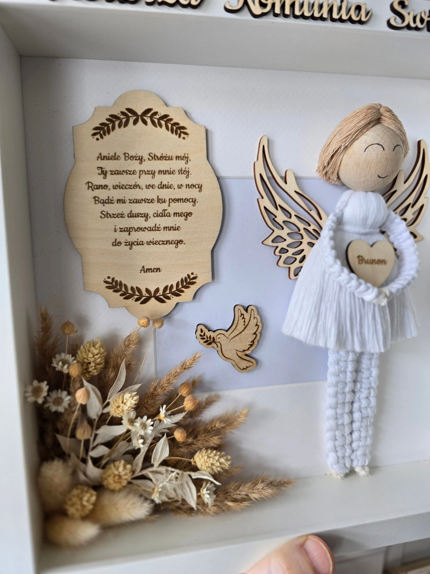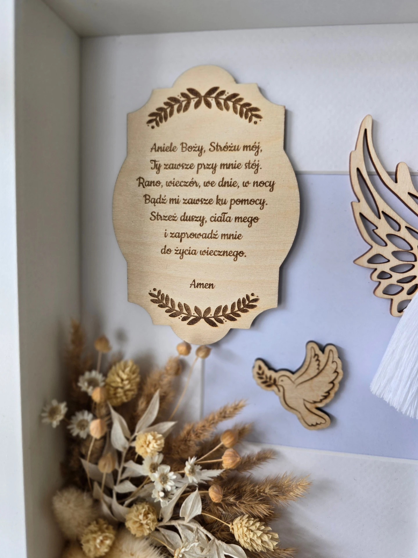 UWAGA! Życzenia na odwrocie w formie tabliczki z dowolnym tekstem można zakupić w osobnej ofercie w zakładce dla rękodzielnika (tabliczki) gdzie znajdują się gotowe modlitwy lub istnieje możliwość wygrawerowania własnego tekstu, który po zakupie należy przesłać na skrzynkę mailową lub skontaktować się poprzez formularz kontaktowy.