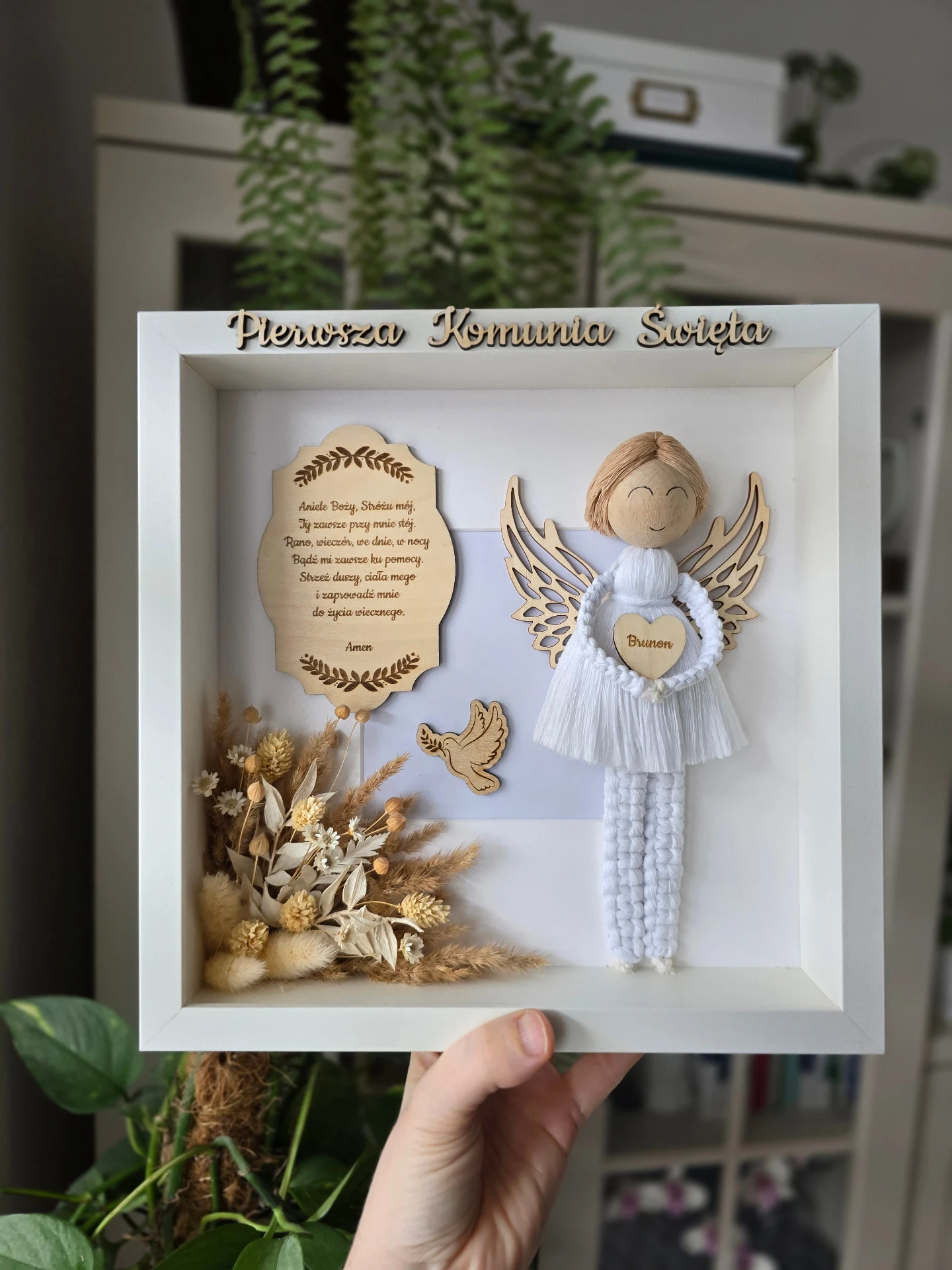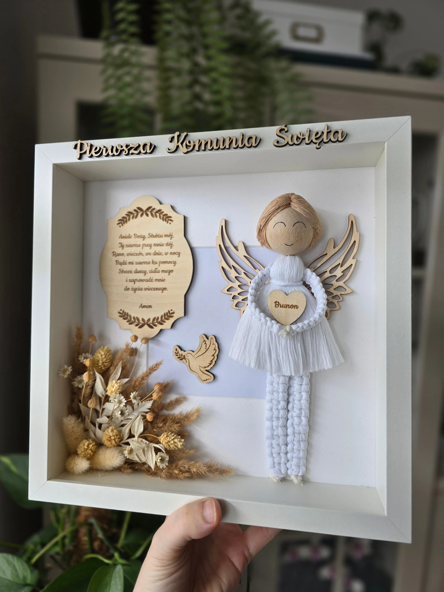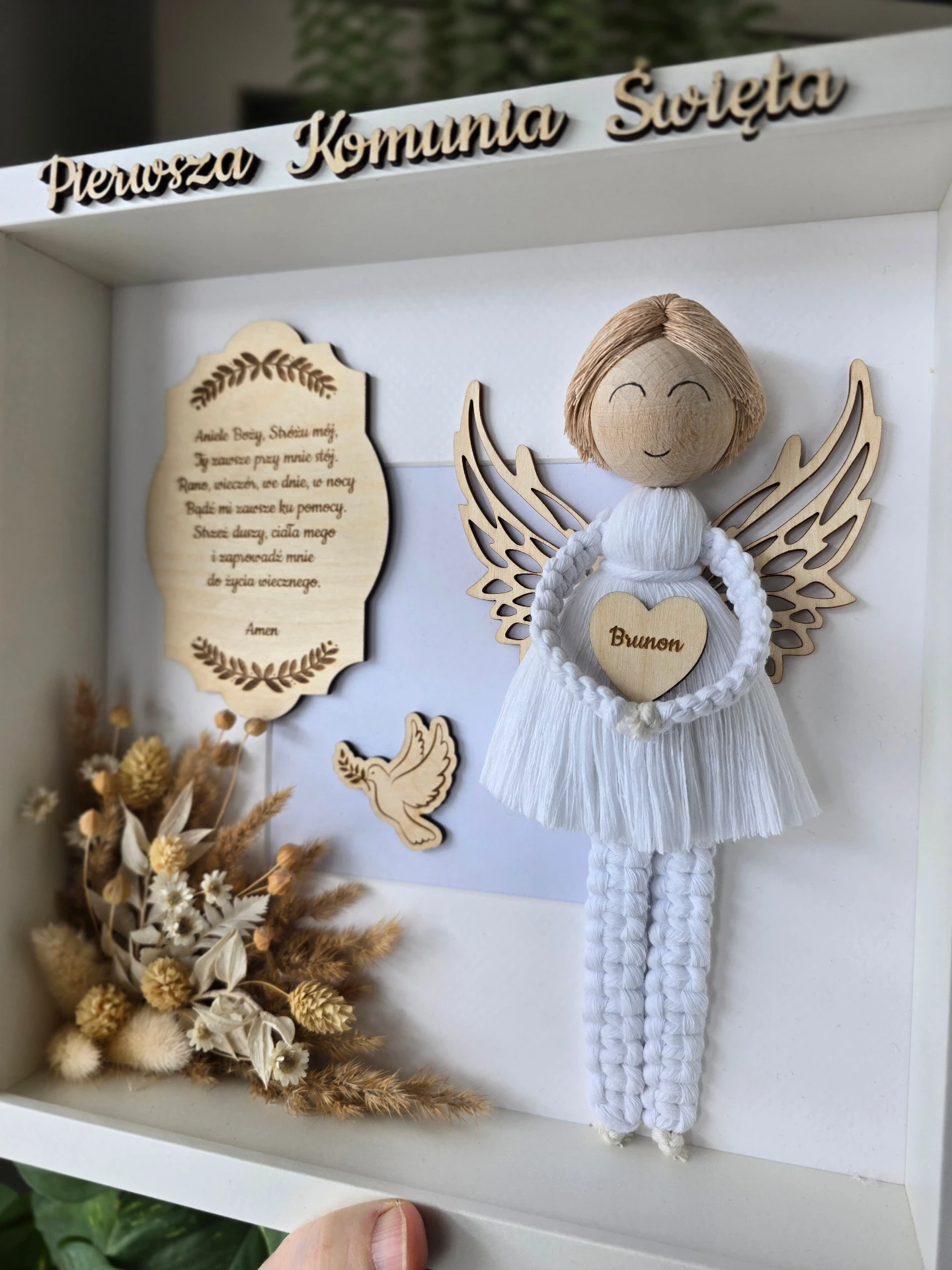 Anioł stróż dla chłopca w ramce z plexi to idealny prezent na Pierwsza Komunię Święta lub Chrzest Święty. Nada się również jako upominek na inne okazje np. roczek