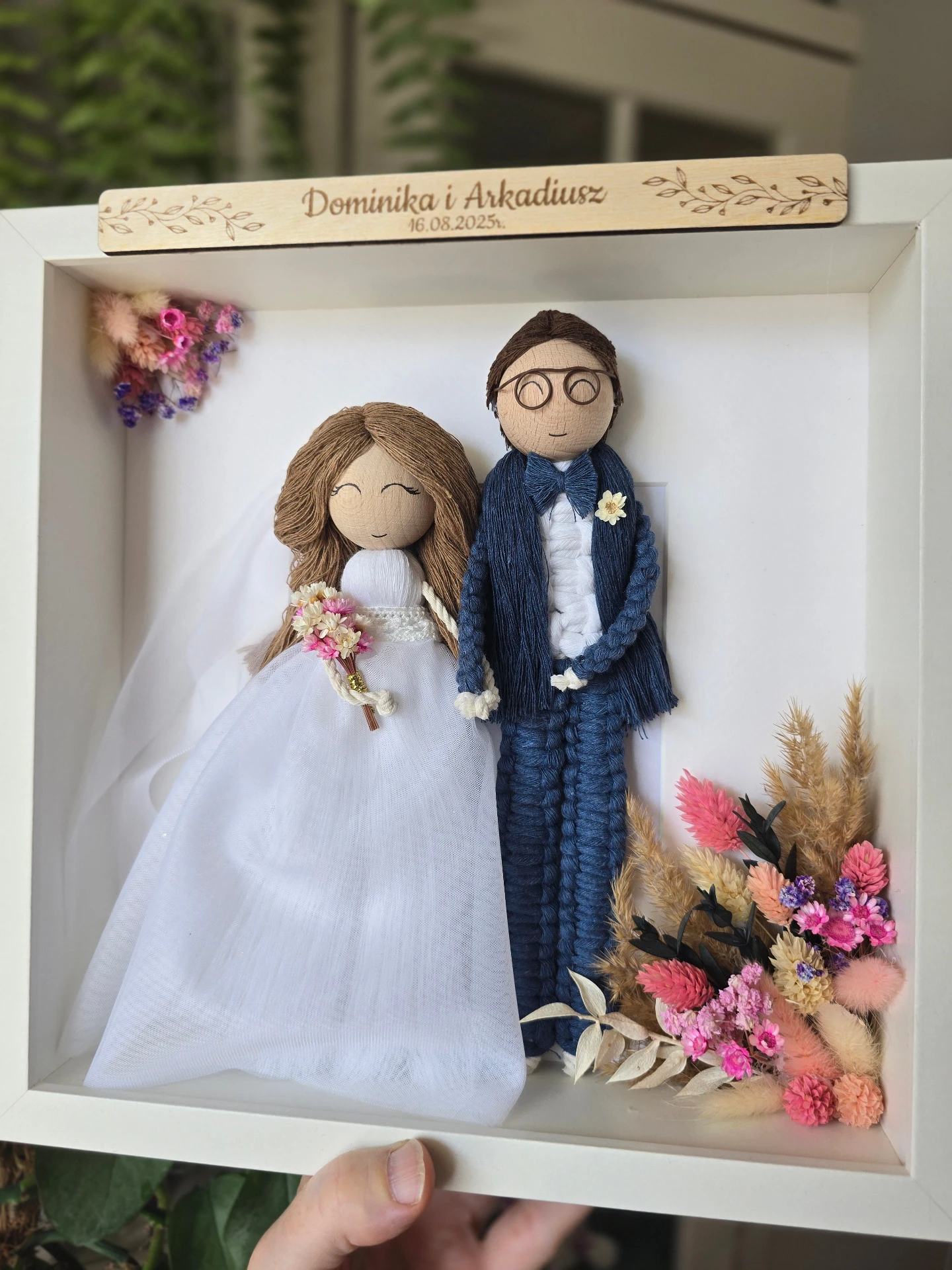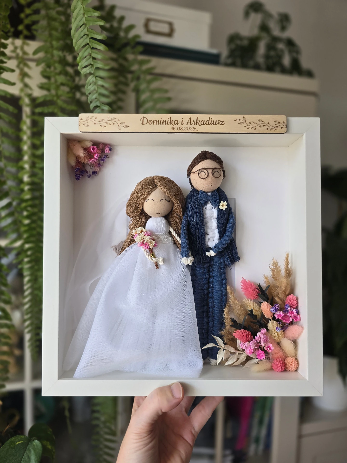 Makramowy portret ślubny w białej gablotce to wyjątkowa i trwała pamiątka, która w niepowtarzalny sposób zatrzymuje wspomnienia najważniejszego dnia.
