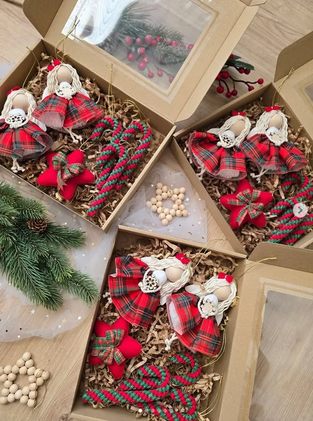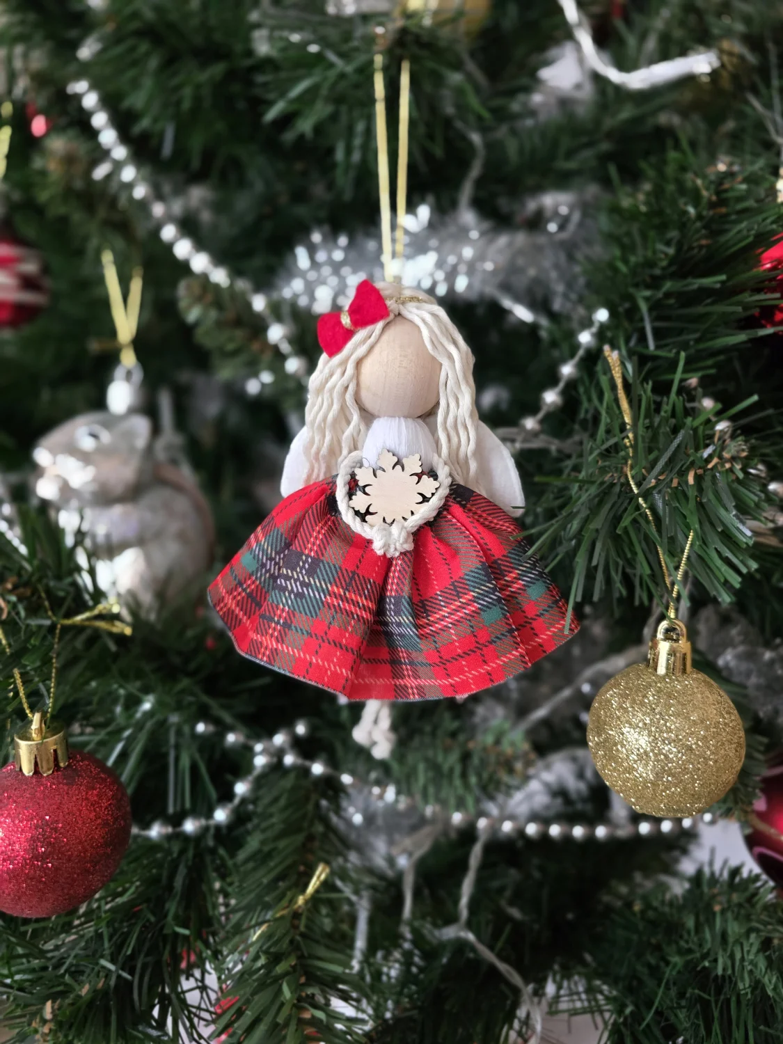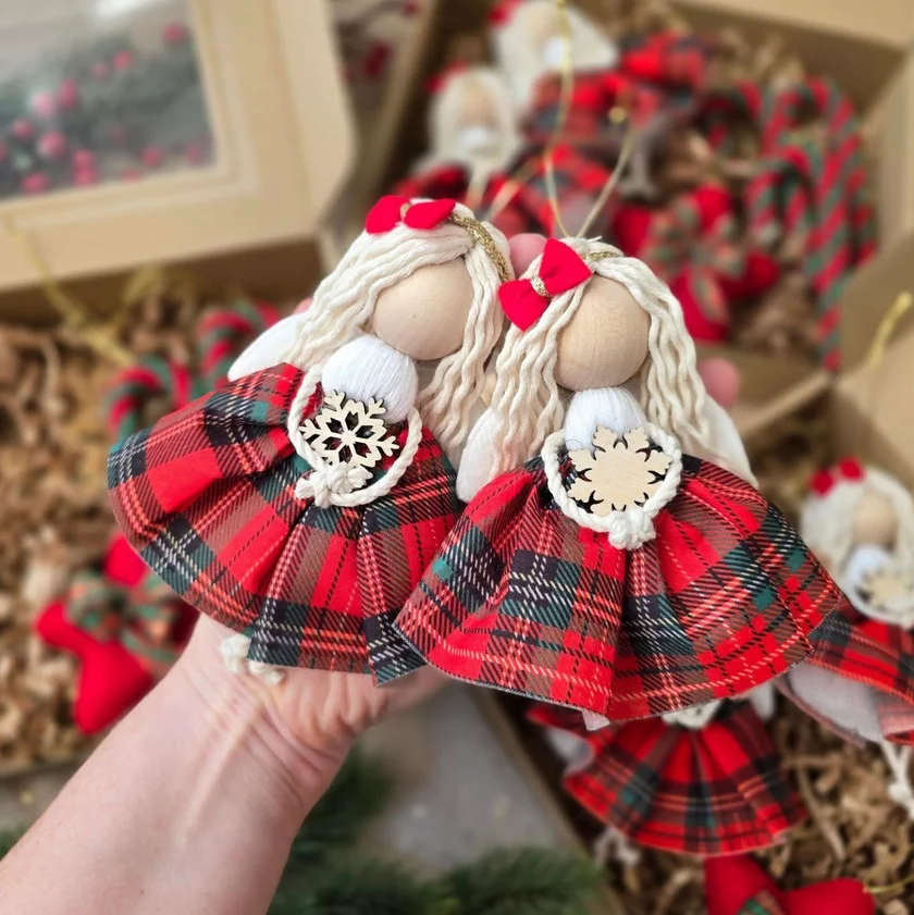 Aniołek świąteczny w piękną czerwono-zieloną krateczkę.
